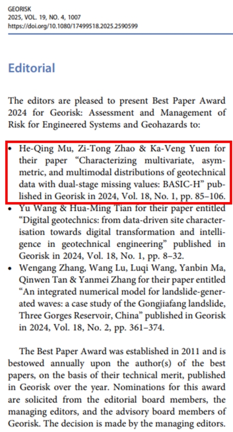 最佳论文奖设立于2011年,每年颁发给《Georisk》期刊上的技术价值最高的论文的作者。该奖项的提名由《Georisk》期刊的编辑委员会成员、执行编辑和顾问委员会成员共同提出,最终由执行编辑决定。