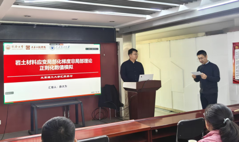 2025年12月3日下午14时,同济大学地下建筑与工程系特聘研究员薛大为应邀在太原理工大学博学馆A座五层岩土会议室,作了题为“岩土材料应变局部化梯度非局部理论正则化数值模拟”的专题学术报告。本次报告由太原理工大学土木工程学院院长孙逸飞教授主持,学院众多师生到场聆听,现场学术氛围浓厚。