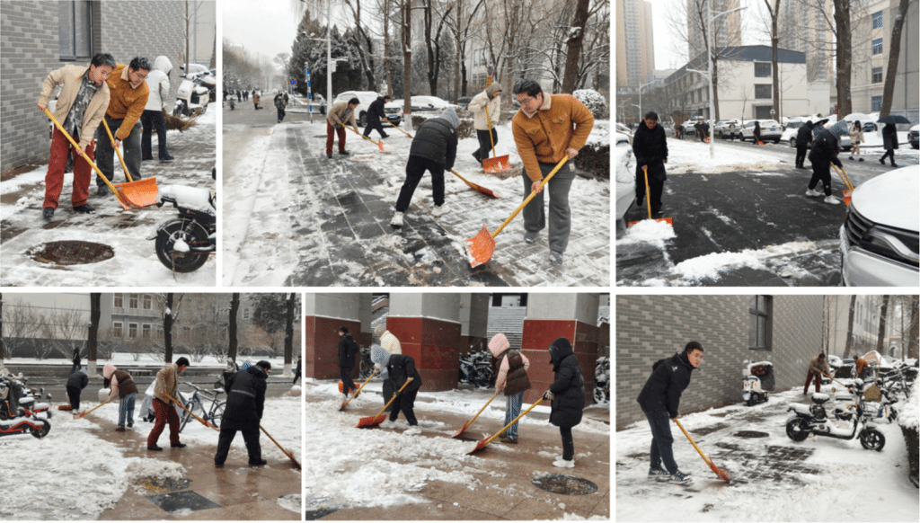 2025年12月12日,太原迎来今冬首场降雪。午后雪势渐缓,校园内积雪覆路、湿滑难行。土木第四研究生党支部迅速响应,以雪为令、闻雪而动,第一时间组织支部党员、预备党员及入党积极分子,携带清扫工具奔赴学院楼前,开展扫雪除冰志愿服务活动。
